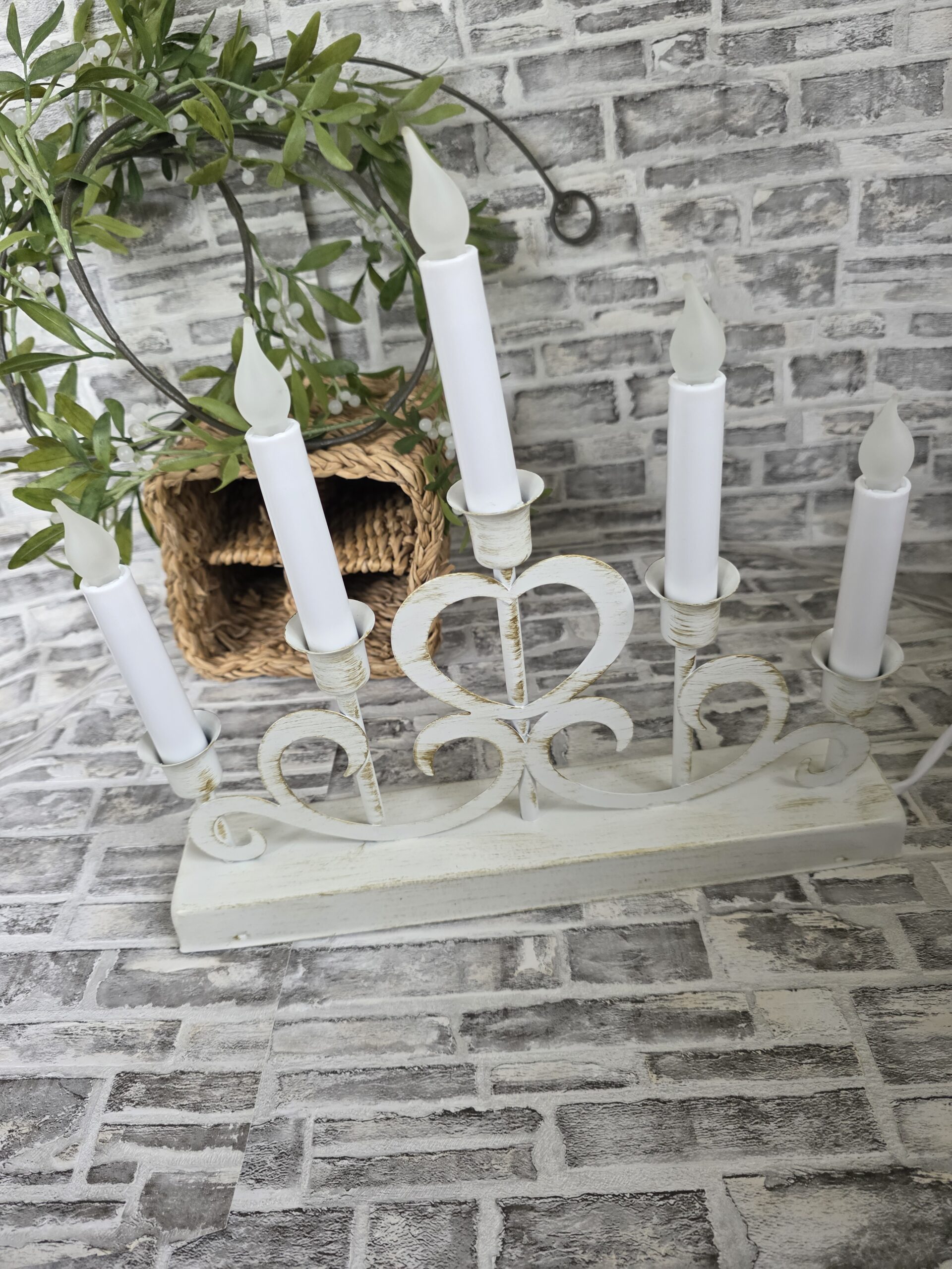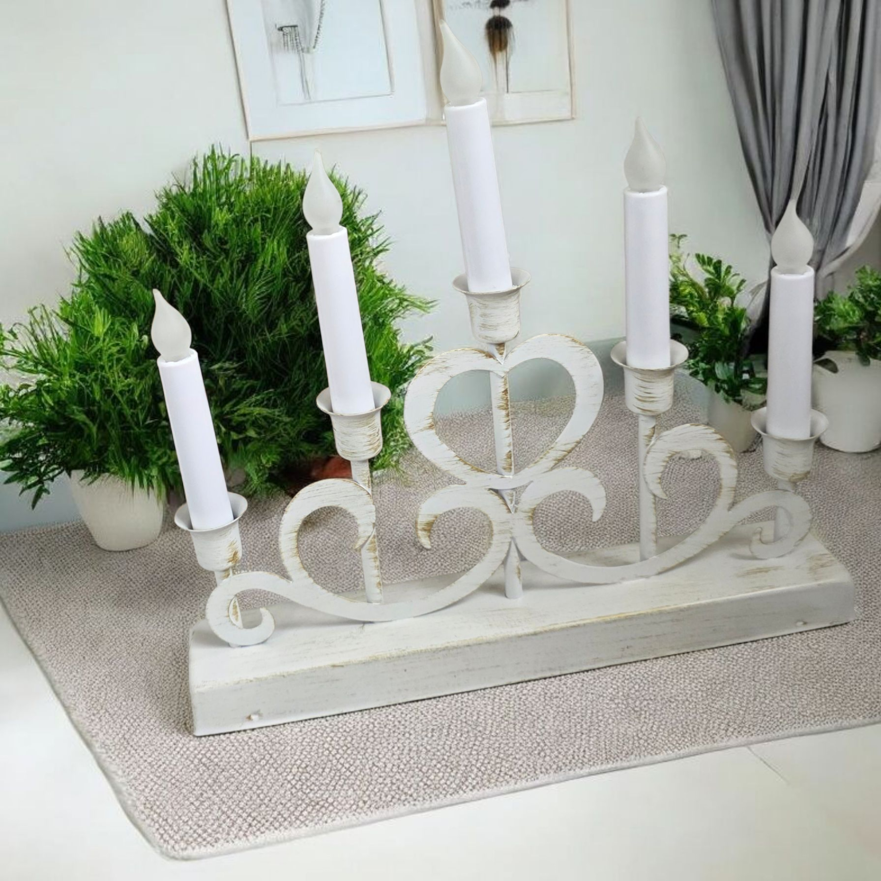 Metalinė žvakidė yra 5 šviesos šaltiniai. Simetriškas žvakių išdėstymas, tolygus šviesos pasiskirstymas. Žvakidės konstrukcija pagaminta iš metalo pagrindo, suteikia stabilumą, atspari kasdieniam naudojimui ir ilgaamžė.